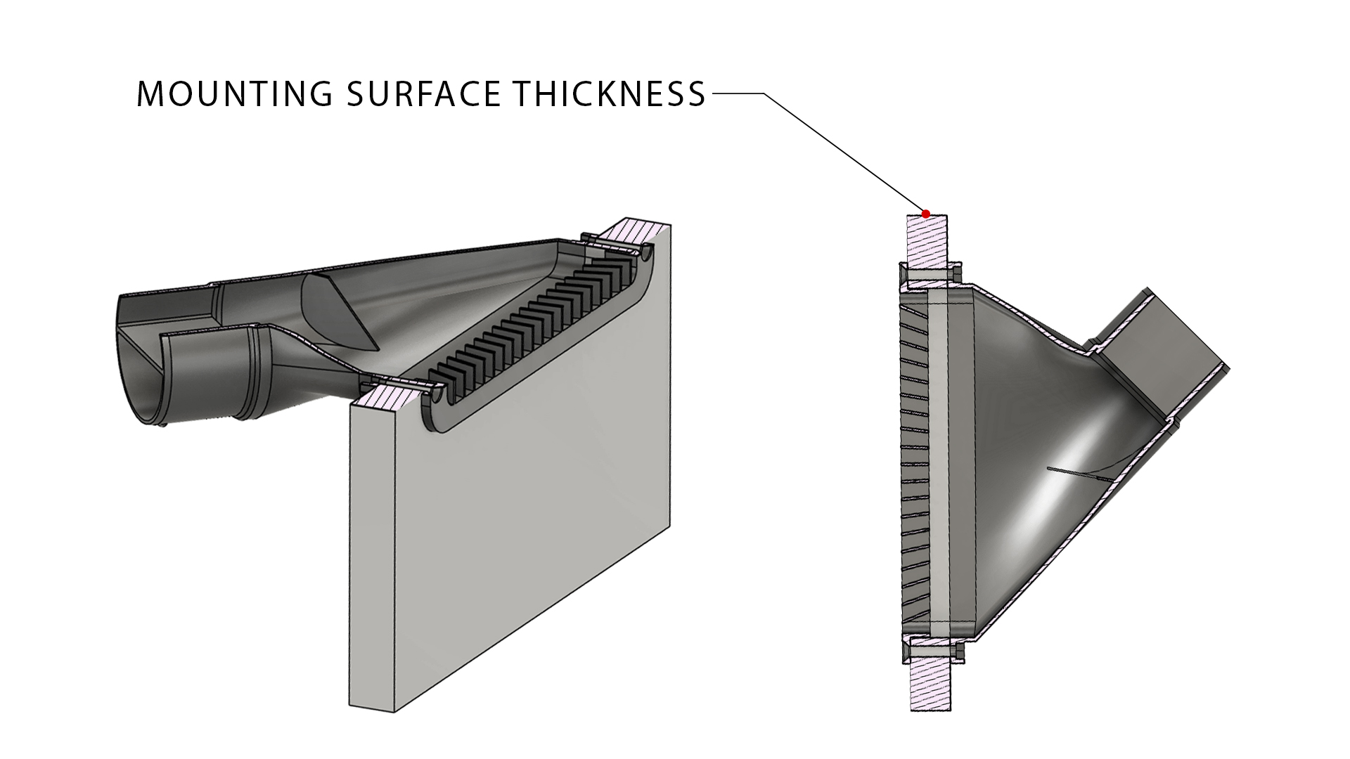 This diffuser comes with DIN 7991 M5x35 screws for mounting surfaces from 0,5 to 24mm in thickness. For thicker surfaces, longer DIN 7991 M5 screws can be used.