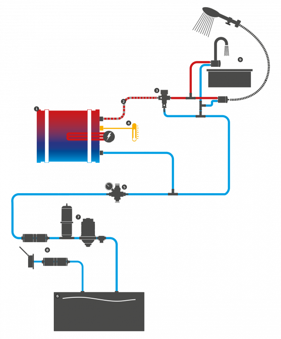 Ensures water circulation. If you already have a pressure water pump in your vehicle, you don’t need to replace it to use with the boiler system.