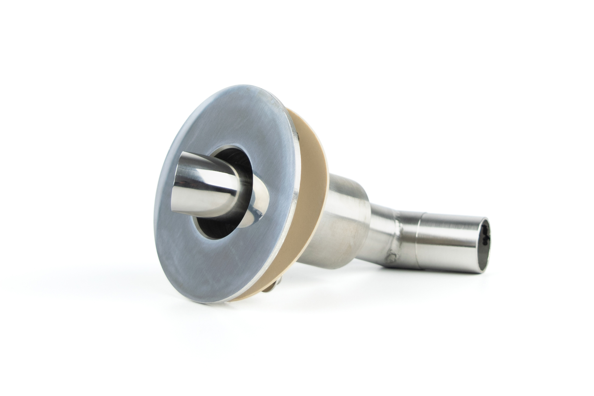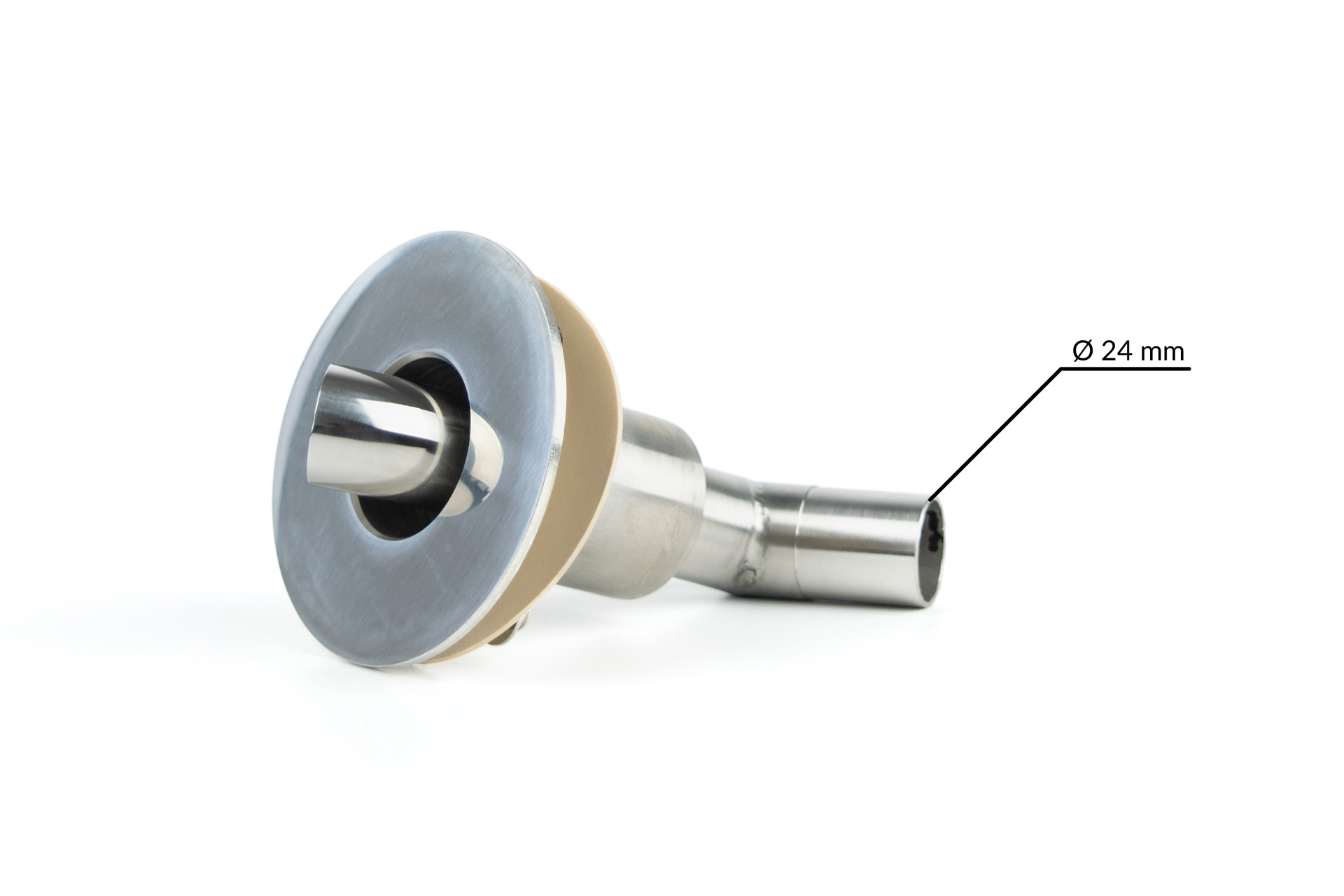 Exhaust adapter for yachts or boats curved assy.AT0013 with outer diameter 24 mm is formed of 316 sort of stainless steel.
