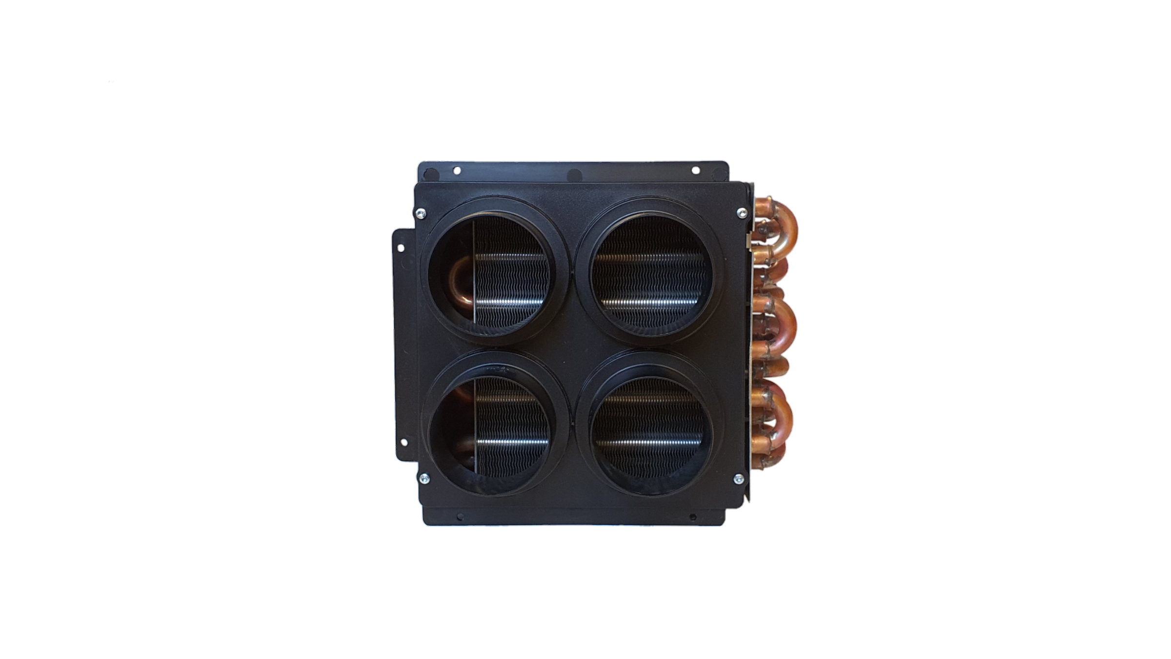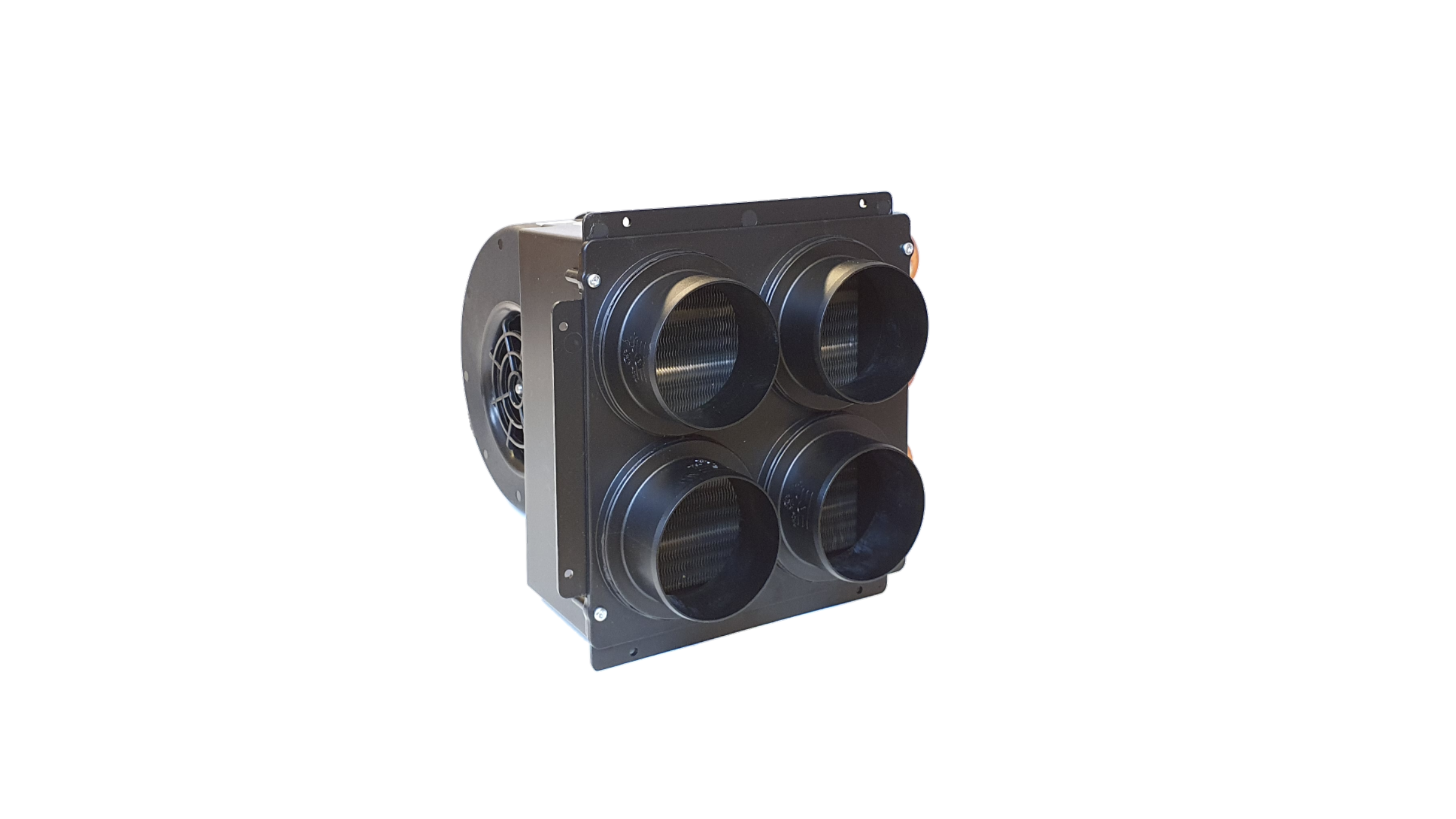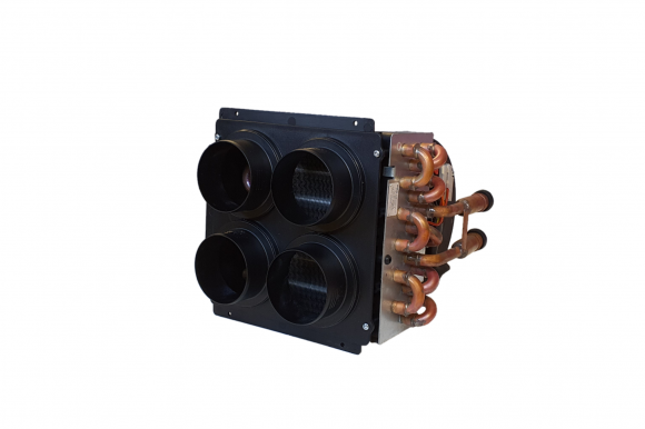 It is a heat exchanger that works as a radiator with an active fan & 4 x ø60 mm air sleeves for even hot air distribution up to 4 rooms. It is possible to use air flow adapters to distribute hot air flow to more rooms (depends on size & insulation of room).