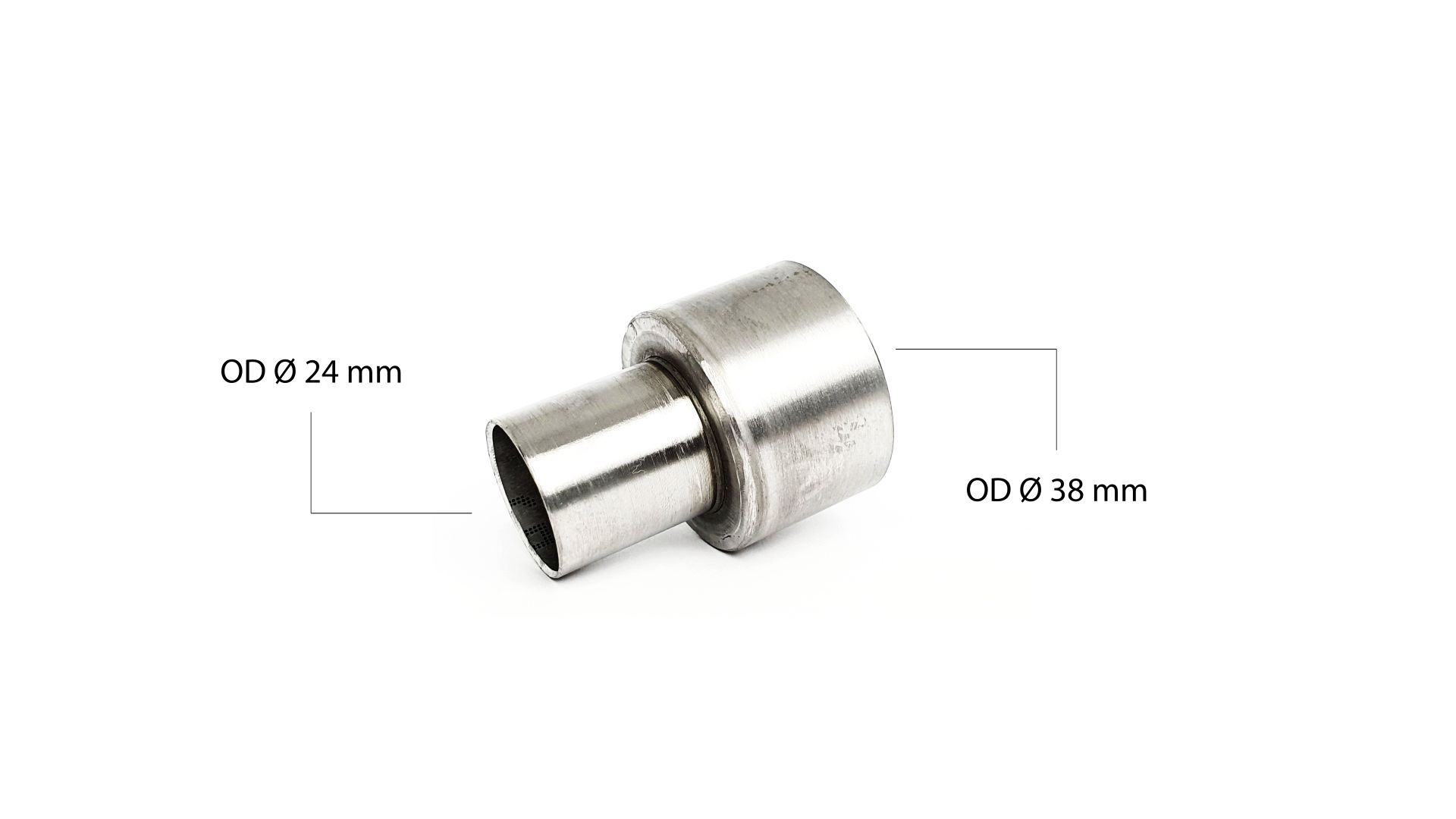 This exhaust pipe transition reduces backpressure by extruding the original 24 mm exhaust pipe to 38 mm exhaust pipe in case a longer exhaust pipe is needed.